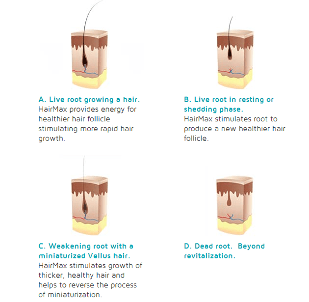 C. Termed “Vellus Hair” (light colored, short, fine “peach fuzz” hairs), the HairMax helps these fine hairs by stimulating them to grow into thicker, more mature hair.