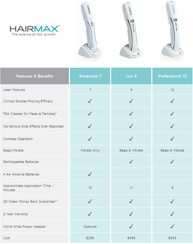 All HairMax LaserComb devices provide the same efficacy and feature a 2 year manufacturer’s warranty and 20 Week Money Back Guarantee**. The chart below describes the device features to help you choose the LaserComb that’s right for you.