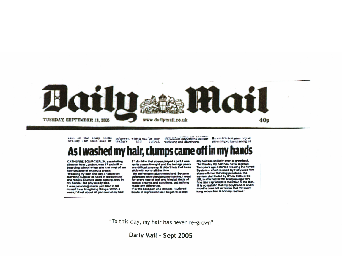 CATHERINE BOURCIER, 34, a marketing director from London, was 17 and still at boarding school when she lost most of her hair because of alopecia aerate.