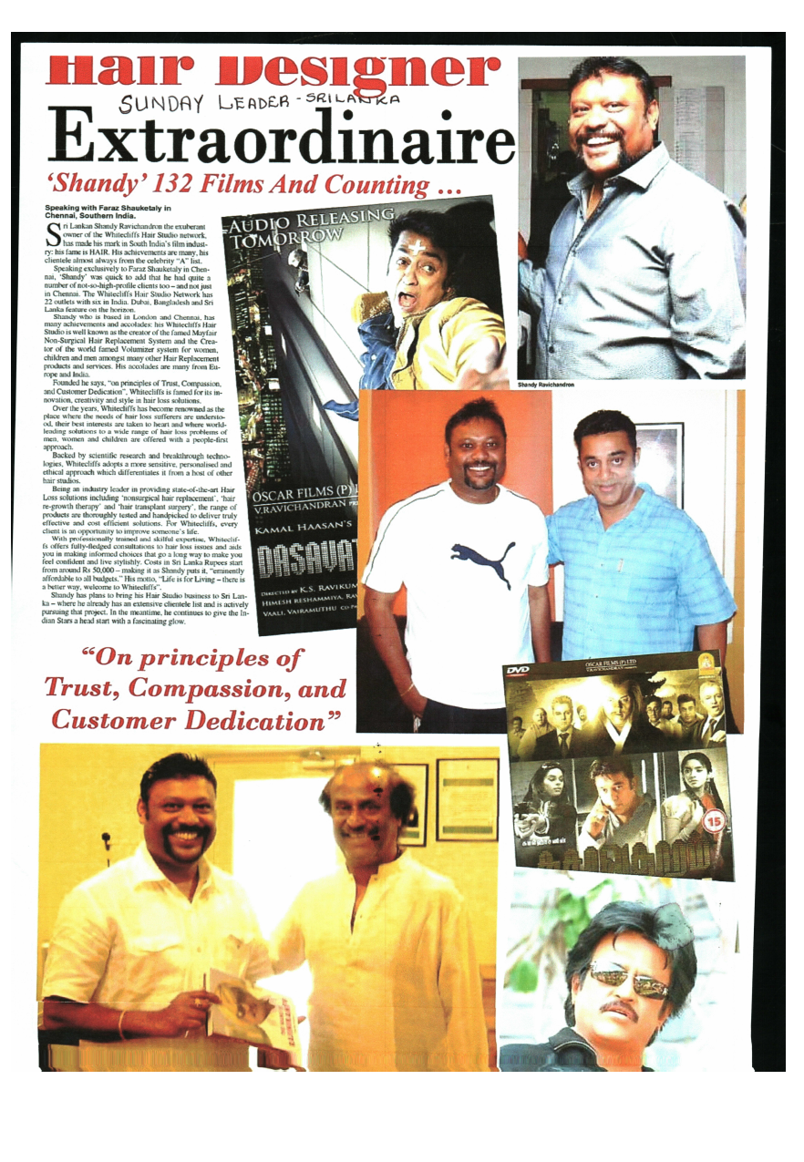 SriLankan Shandy Ravichandran the exuberant owner of the WHITE CLIFFS Hair Studio network has made his mark in South India’s film industry: his fame is HAIR. His achievements are many; his clientele almost always from the celebrity “A” list.