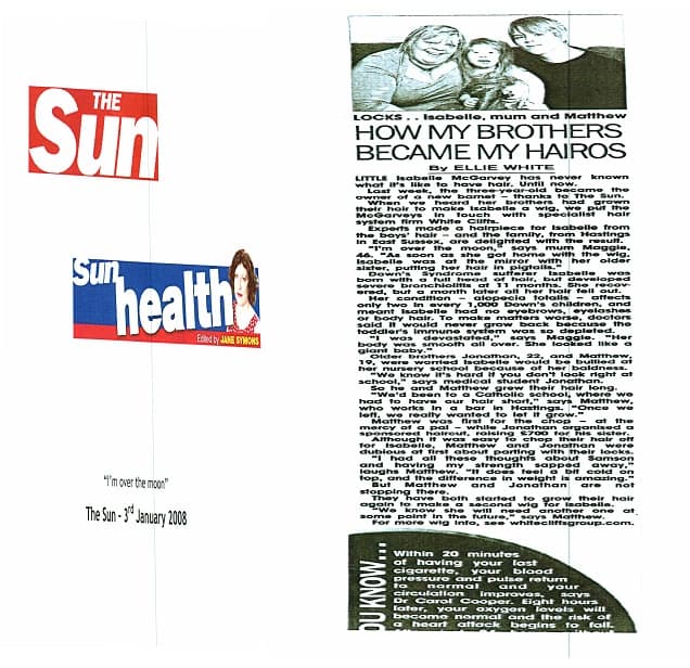 When we heard her brothers had grown their hair to make Isabelle a wig, we put the McGarvey in touch with specialist hair system firm White Cliffs. Experts made a hair place for Isabelle from the boys’ hair – and the family, from Hastings in East Sussex, are delighted with the result.