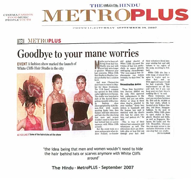 Maybe you’ve been suffering from hair loss. Maybe you just with your hair very longer or glossier. Whatever your hair concerns White Cliffs Hair Studio in Mayfair, London probably has a solution for it and now in Chennai-it’s don’t have to travel to Mayfair for those treatments. The U.K.-based company has opened its first Indian outlet right here in Chennai. the studio was launched in style at the accord metropolitan recently with a trendy fashion show choreographed by Ajith menon – first with models sporting funky hats, then funkier hair extensions and hair dos (the idea being that men and women wouldn’t need to hide their hair behind hats or scarves anymore with White Cliffs around).
